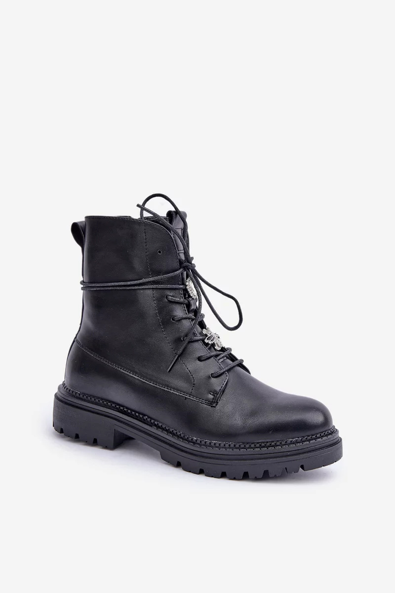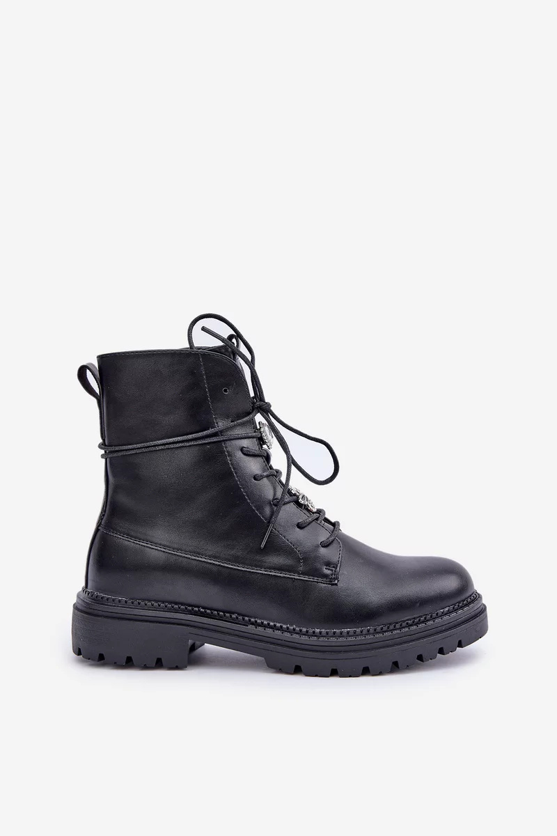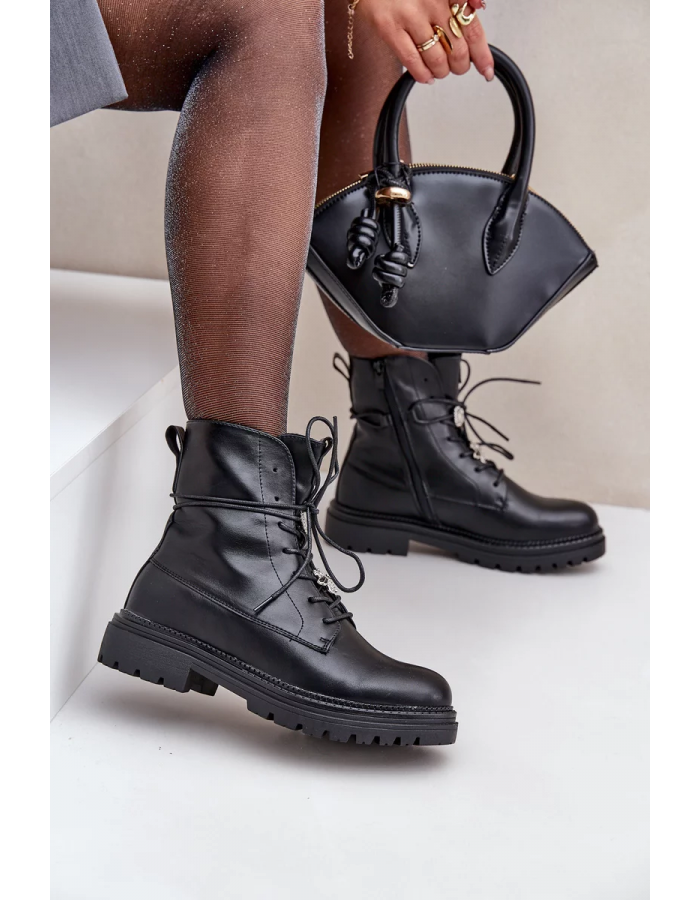 Kotníkové boty z eko kůže na plochém podpatku jsou skvělou volbou pro chladnější dny. Model se vyznačuje zaoblenými špičkami a šněrováním, ozdobeným efektními připínáčky, které dodávají výjimečný půvab. Vnitřek zateplený obuvnickou dekou zajišťuje teplo a pohodlí při nošení. Praktické a módní, ideální pro každodenní stylizace! Při výběru velikosti se prosím řiďte tabulkou velikostí.