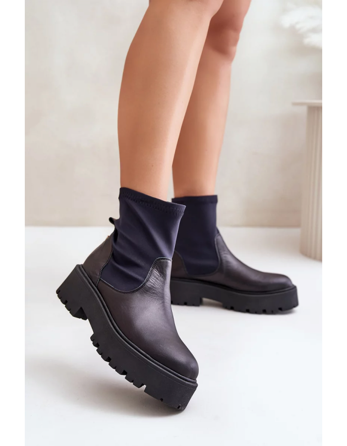Damskie botki z cholewką za kostkę, wykonane z wysokiej jakości skóry naturalnej. Osadzone na platformie i płaskim obcasie, zapewniają wygodę podczas codziennego noszenia. Wsuwany model z zaokrąglonymi noskami łączy w sobie elegancję i komfort, doskonały na różne okazje i stylizacje. Przy wyborze rozmiaru prosimy sugerować się tabelą rozmiarów.