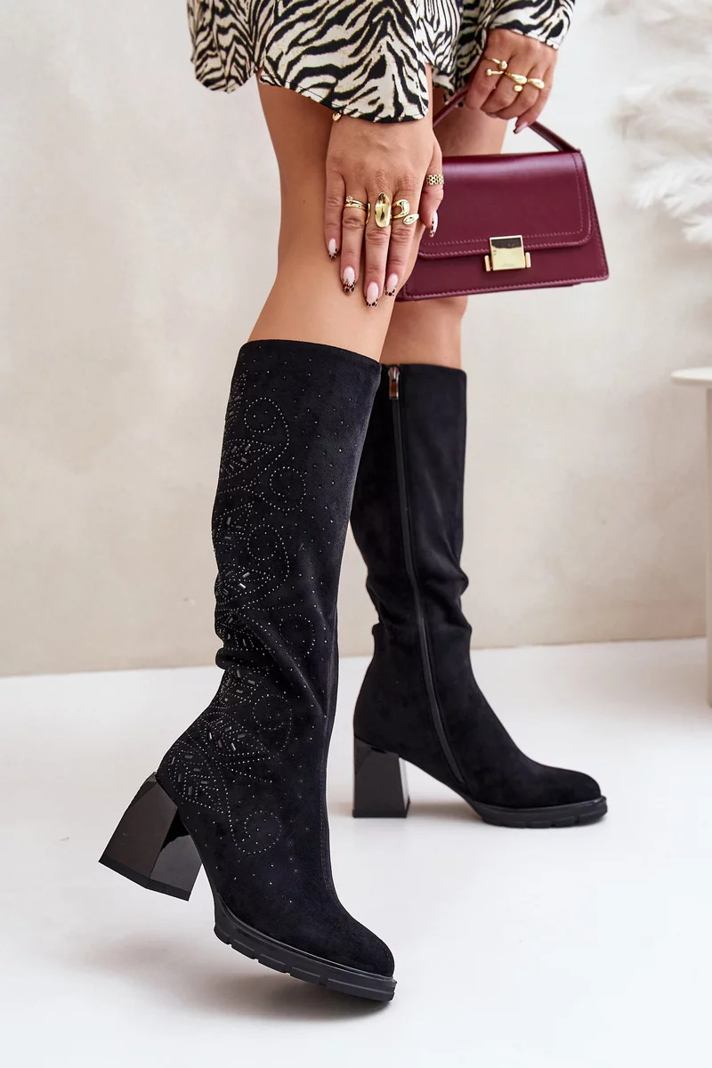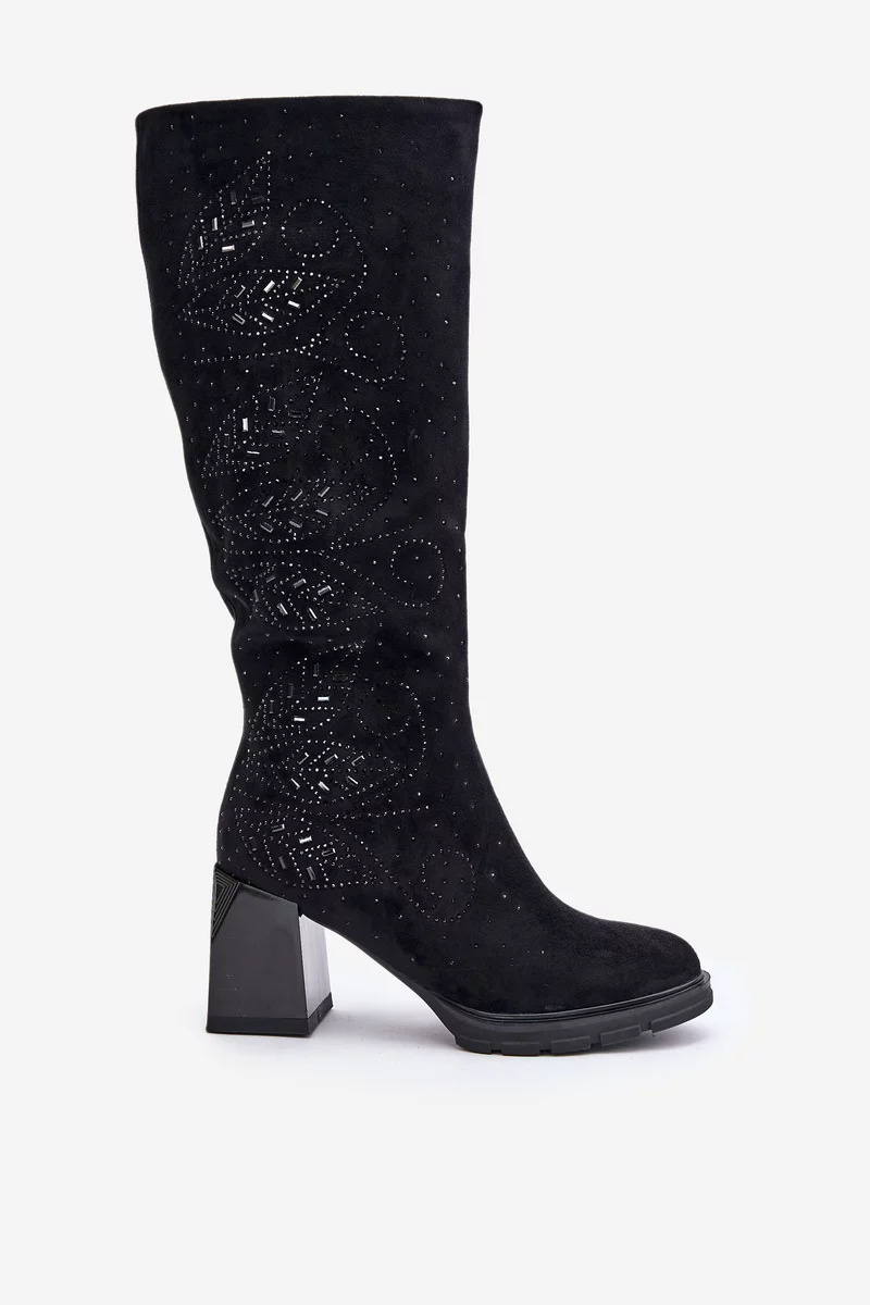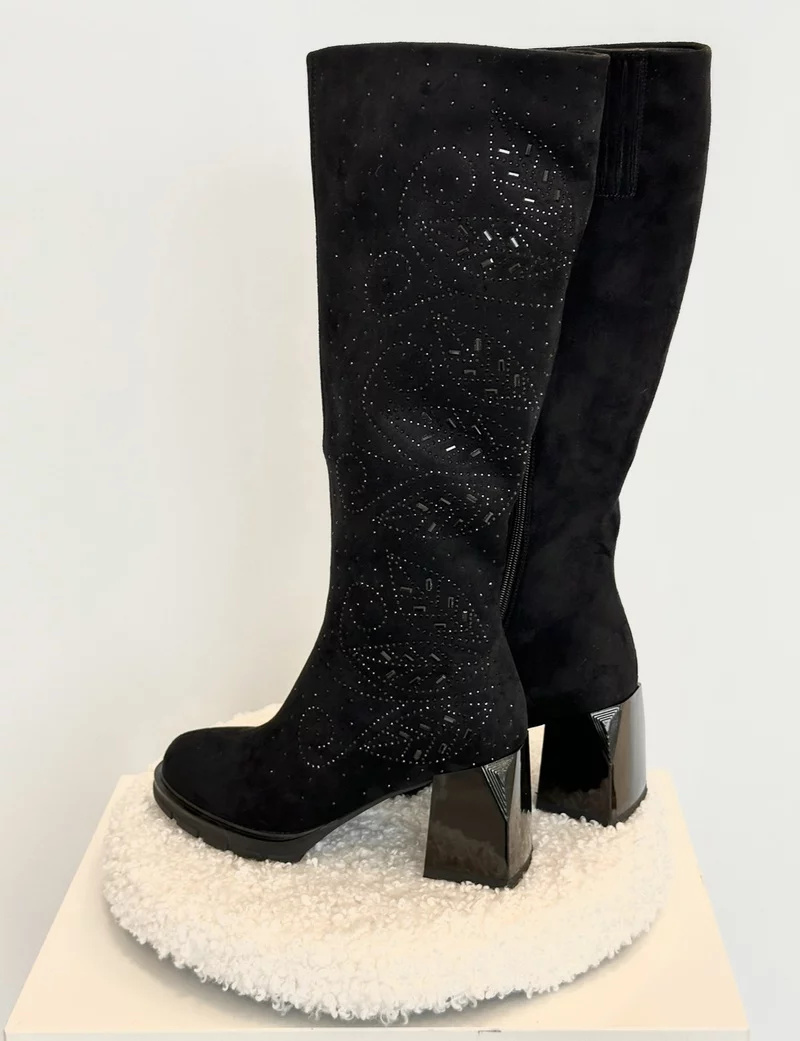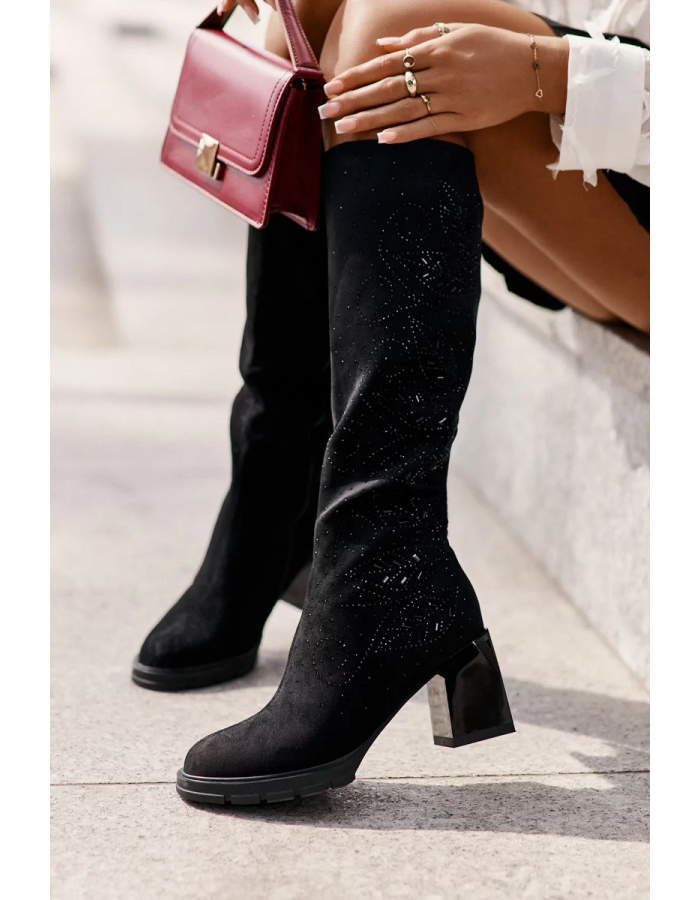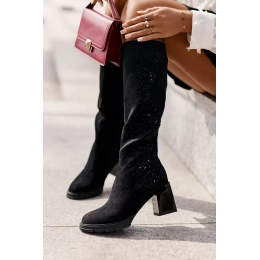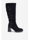 Osazené na podpatku ve tvaru sloupku. Hlavní předností tohoto modelu je zdobení na svršku. Zaoblené špičky. Střed zateplený obuvnickou dekou. Svršek sahá před koleno. Při výběru velikosti se prosím řiďte tabulkou velikostí.