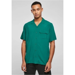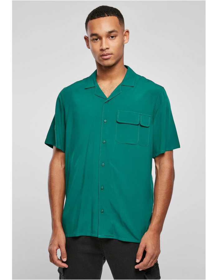 Pánská košile je vybavena klopovým límcem a dvěma různě velkými náprsními kapsami s klopami, které sedí vedle sebe. Styl dotváří knoflíková léga, ramenní sedlo a krátké rukávy. Pánská košile je ušita z lehké tkaniny z viskózy a má regular fit.