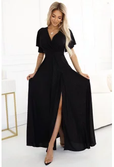 581-1 JENNIFER połyskująca długa suknia z rękawkiem i dekoltem - CZARNA Z BROKATEM