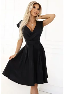 348-10 SCARLETT rozkloszowana sukienka z kopertowym dekoltem i paskiem - CZARNA Z BROKATEM
