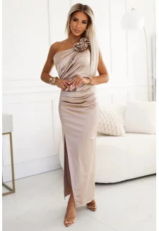 580-1 AURORA długa satynowa suknia na jedno ramię z różami - BEŻOWA