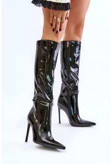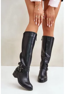 Dámské Kozačky Pod Kolena Na Plochém Podpatku S Přezkami Černé Lotina