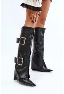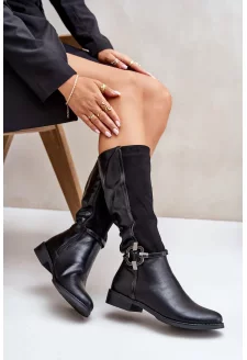 Zateplené Kozačky Na Ploché Podpatku S Ozdobnou Přezkou Černé Leatharia