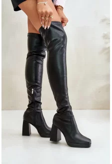 Dámské kozačky nad koleno na sloupkovém podpatku s ozdobným páskem Jolivine – černé
