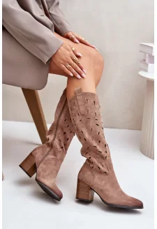 Dámské kozačky na nízkém podpatku s perforovaným vzorem S.Barski – béžové, eko kůže