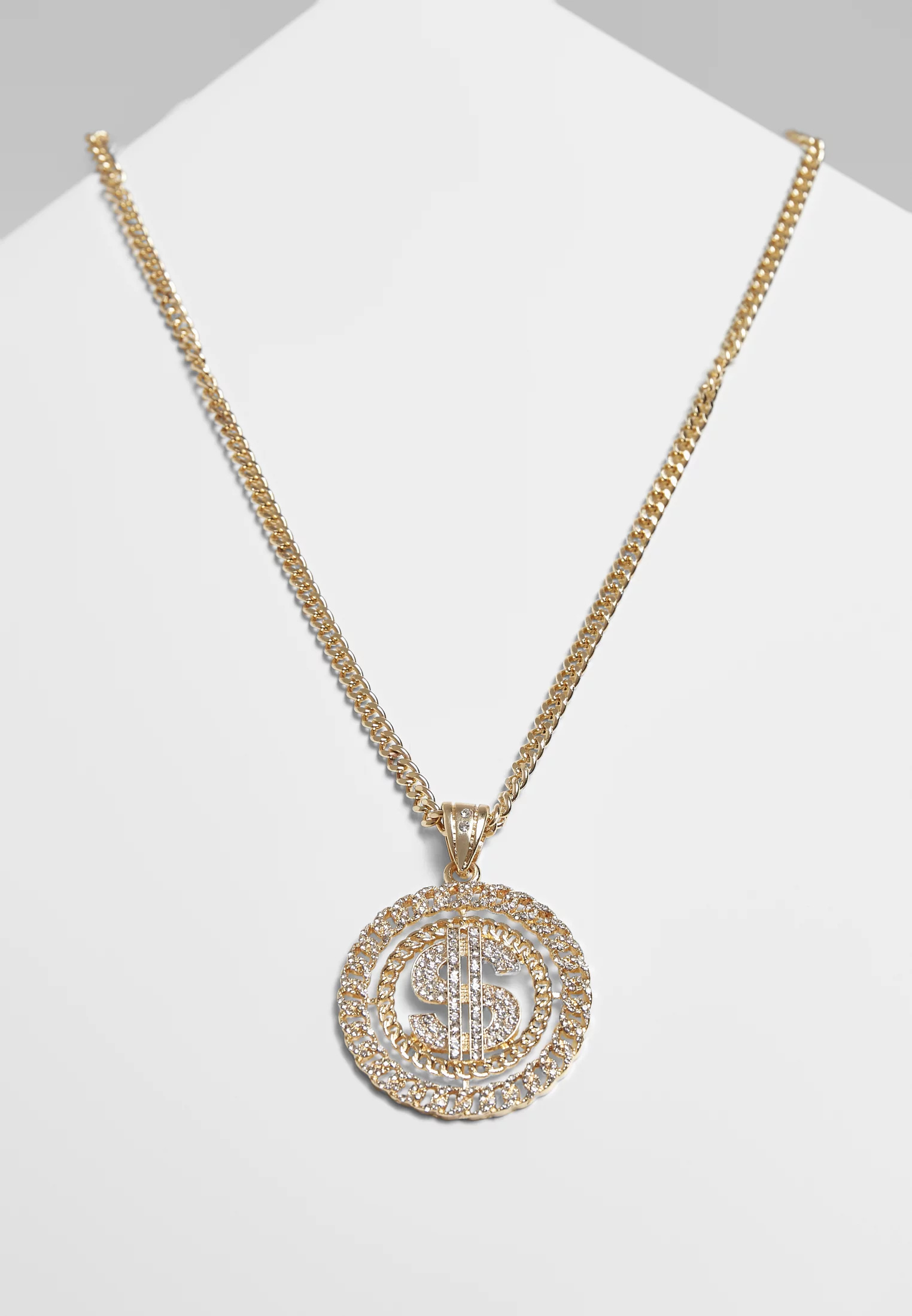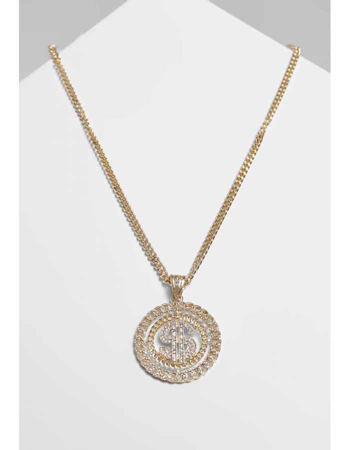 Peníze vládnou světu, tak proč nehrát podle jejich vlády? Tento módní náhrdelník s řetízkem ukazuje nádherný přívěsek, který se zaměřuje na kulatý amulet znaku dolaru. Pro poskytnutí většího "bling-bling-efektu" je amulet osazen třpytivými kameny. Vzhledově ladí pozlacený článkový řetěz ze zinku a železa.