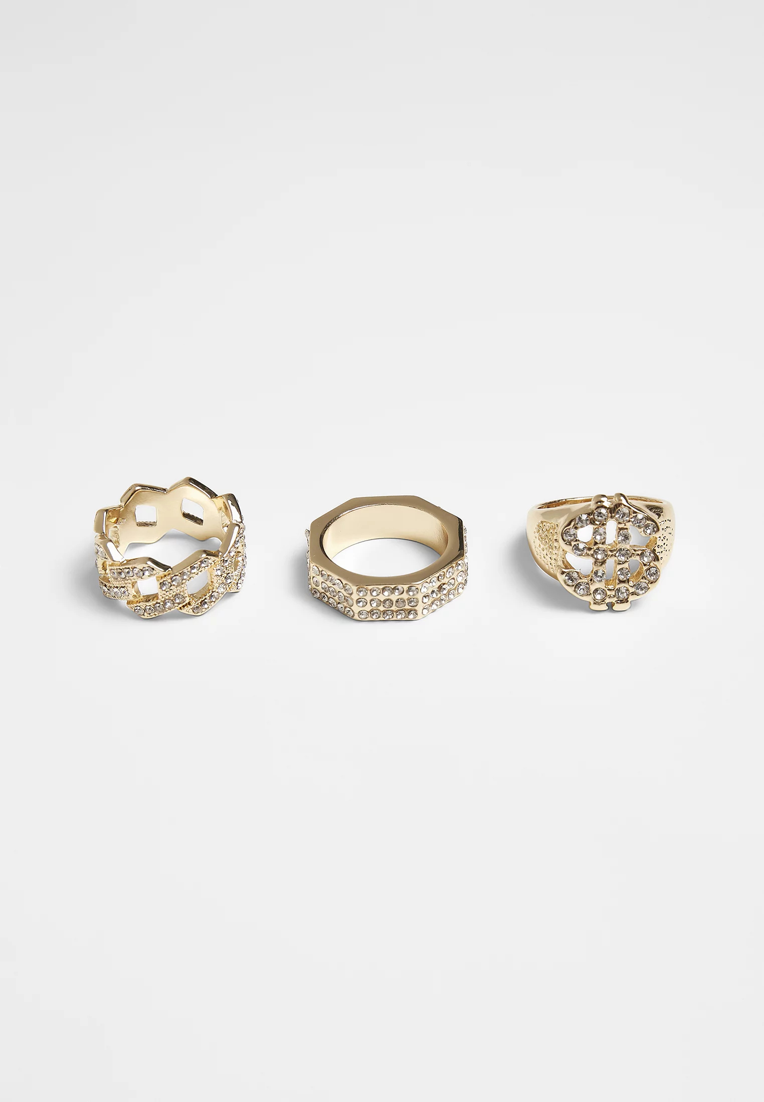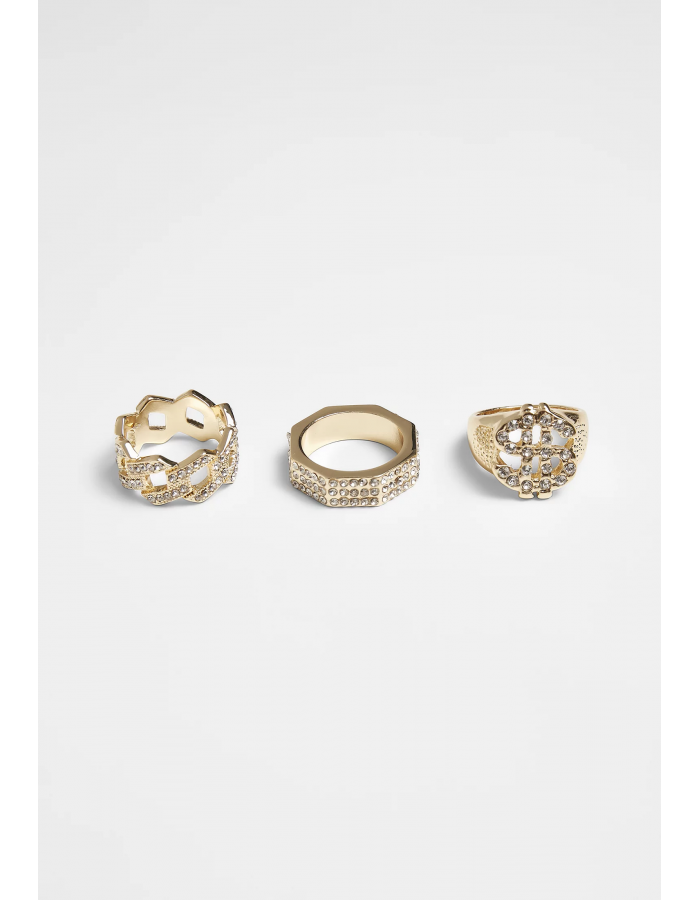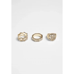 Sada módních šperků, která kombinuje tři kamínky osázené prsteny různých tvarů. Jeden pečetní prsten nese výrazný motiv dolaru zdobený kamínky, další prsten má hranatý tvar a je posetý třemi řadami kamínků. Třetí prsten obsahuje do sebe zapadající články, které připomínají korunu. Sada šperků Urban Classics je vyrobena ze slitiny zinku.Dostupné ve velikostech prstenů 57 S / M a 60 L / XL.