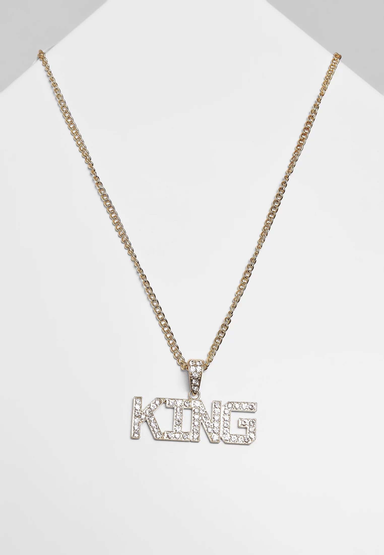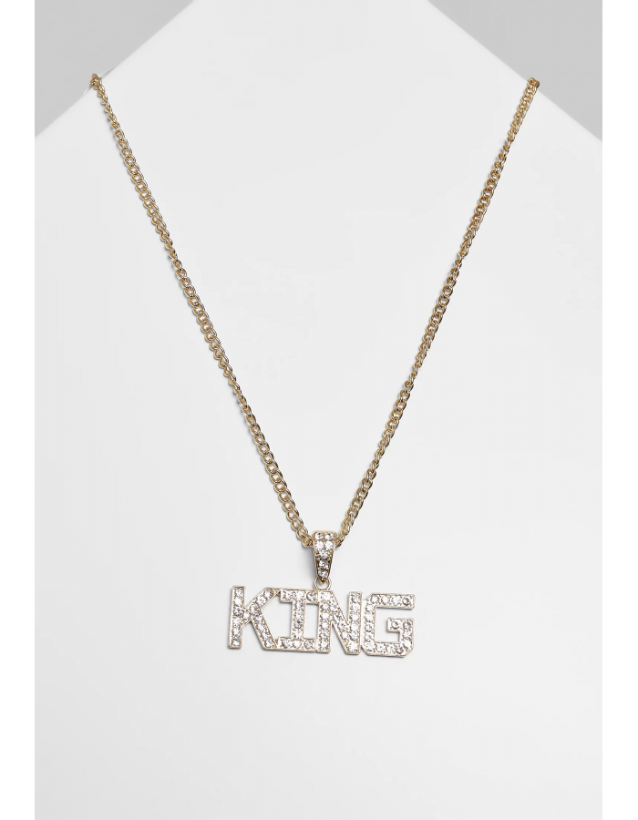 Tento demonstrativní náhrdelník se vyznačuje obzvláště silným přívěskem. Přívěsek "Král" s velkými písmeny je zdobený třpytivými kamínky, takže vyzařuje módní sílu. Kyčelní doplněk je vyroben ze železa a slitiny zinku. Náhrdelník autenticky doplní každý městský outfit.